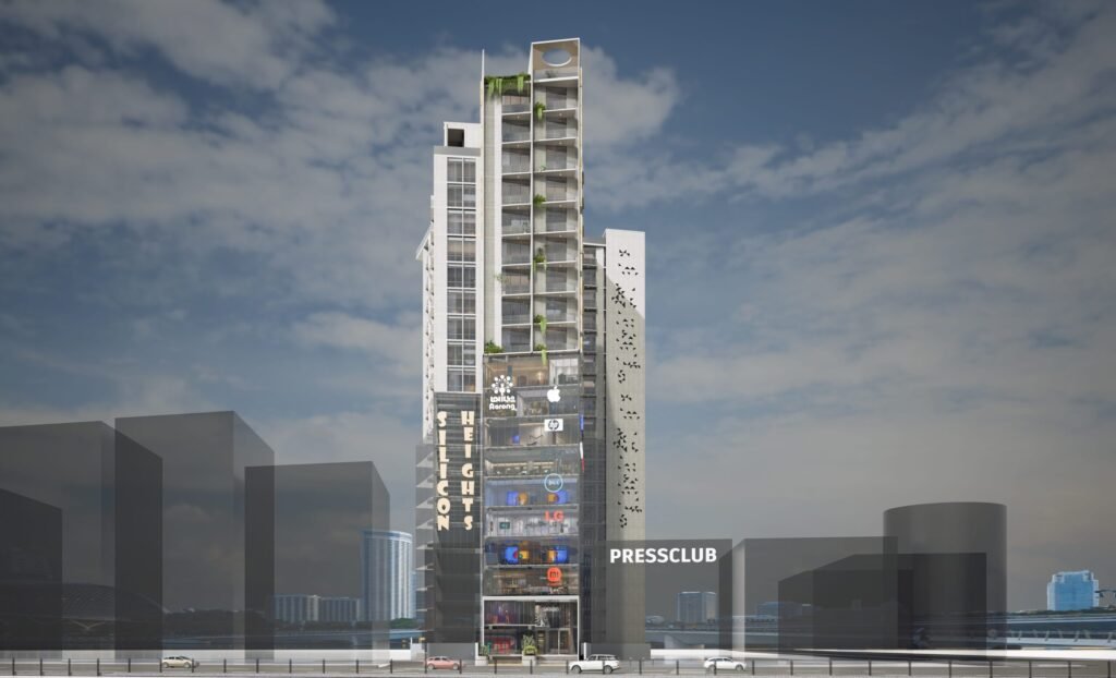 To create a unique identity and emphasize on the soaring high-rise, the building is foreshadowed by a juxtaposed glazing plane that creates a grand and inviting entry into the premises. This design reflects state of art construction material and technology that consolidates the presence of elite clientele such as that of Hejaj Corporation.